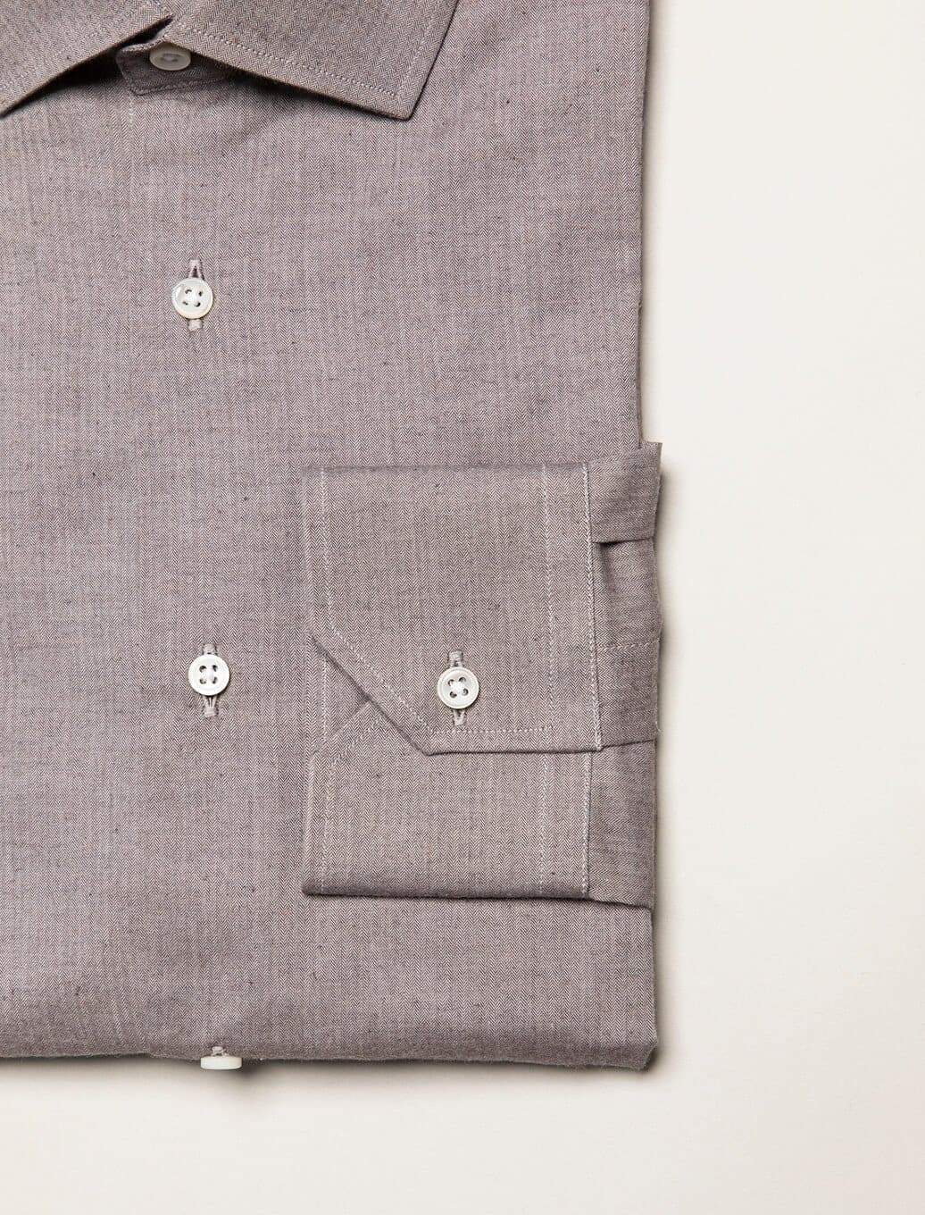 • This Light Brown Small Herringbone Cotton Shirt is crafted by a team of skilled artisans in a camiceria in Sicily. The soft cotton fabric used for this shirt is sourced from one of the top Italian shirting cloth producers; Canclini. The unique light brown fabric has a tinge of grey in it and features a very subtle small herringbone pattern adding depth to a classic shirt. The colourway of this shirt makes it easy to style with a multitude of classic colours.